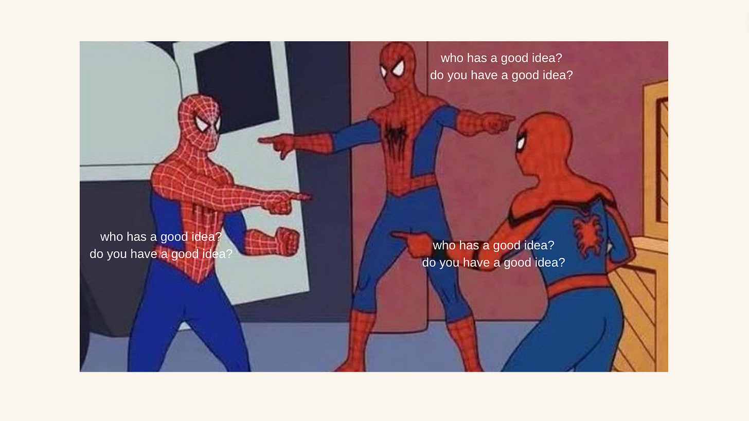 shared with me last week. It means “it is solved by walking.” So I put on my sexiest walking shoes and headed to my nearest high street for a coffee. It’s about 4 kilometres away but I used it as a brainstorming session and it was good to stretch my legs. I listened to a podcast, then some music.Nothing came to me. I imagine that there are multiple versions of me that live inside my head. We are re-enacting that spiderman meme where they all point to each other. Except each of my versions are asking “who has a good idea?”